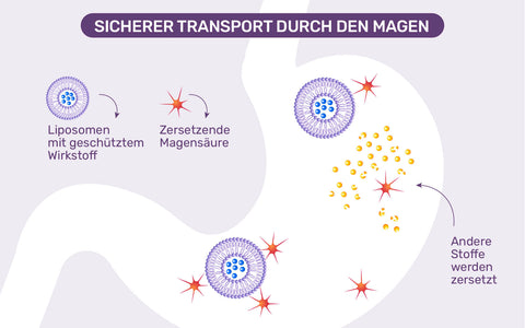 Liposomen bieten einen entscheidenden Vorteil im Verdauungstrakt: Sie schützen empfindliche Nährstoffe vor der Zersetzung in Magen und Darm. Die phospholipidbasierte Hülle bildet eine stabile Barriere, die die Wirkstoffe intakt hält, bis sie die Darmwand erreichen.